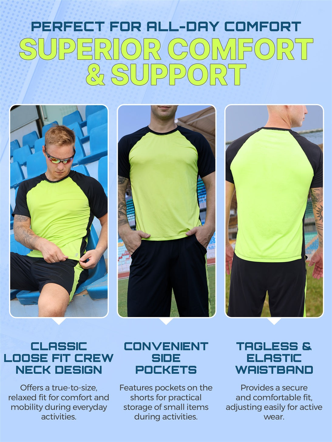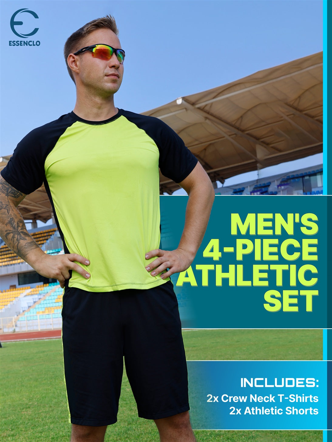 Introducing Essenclo Mens Athletic Clothing Sets - the ultimate 4-piece set for athletes on the move! The high-performance tagless crew neck T-shirt Mens' clothing sets feature a classic loose fit design for maximum comfort and mobility during any physical activity. Made of lightweight and breathable 90% Polyester and 10% Spandex fabric, our shirts and shorts feature 4-way stretch contrast side panels for enhanced mobility and a full range of motion.